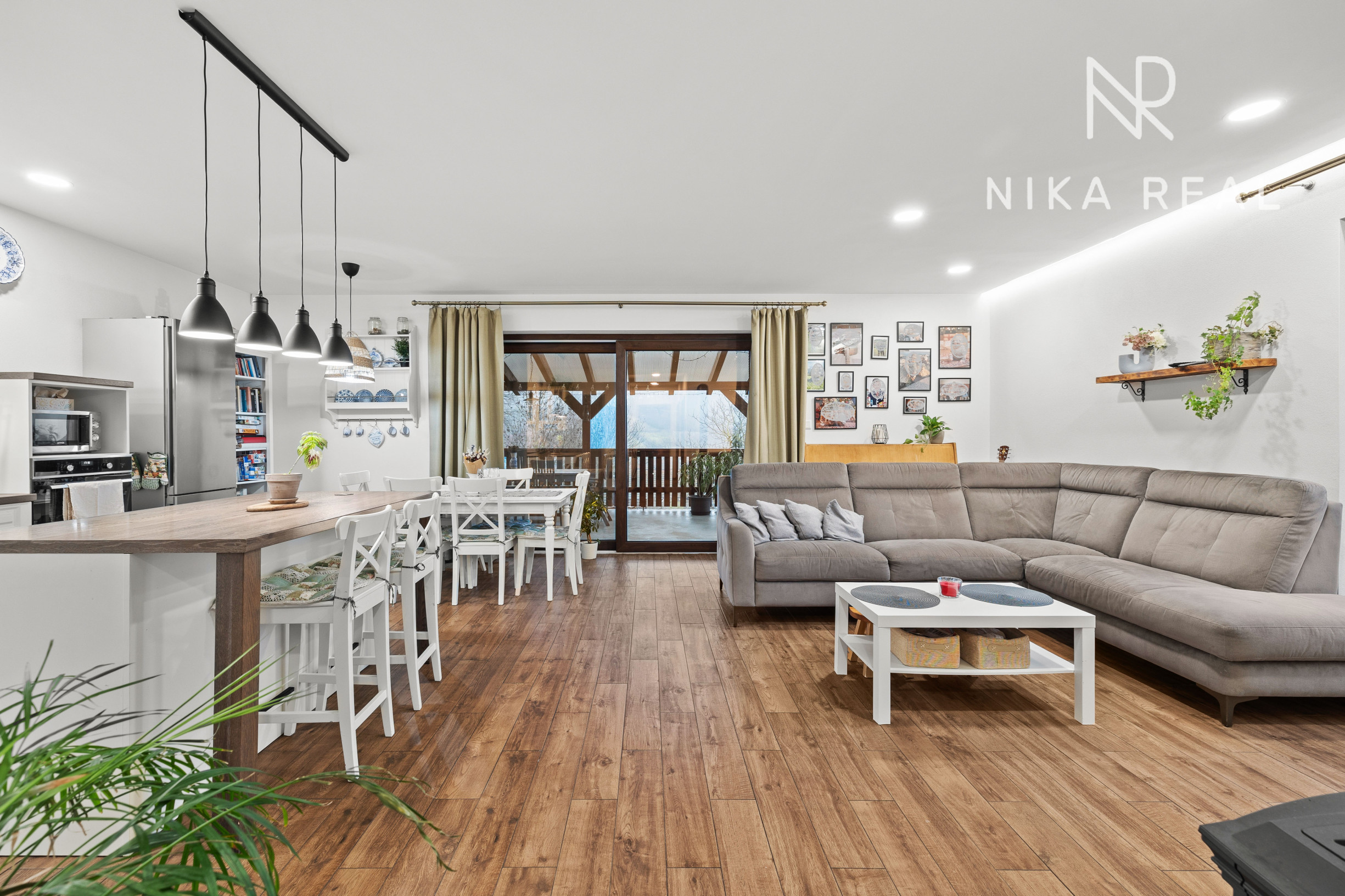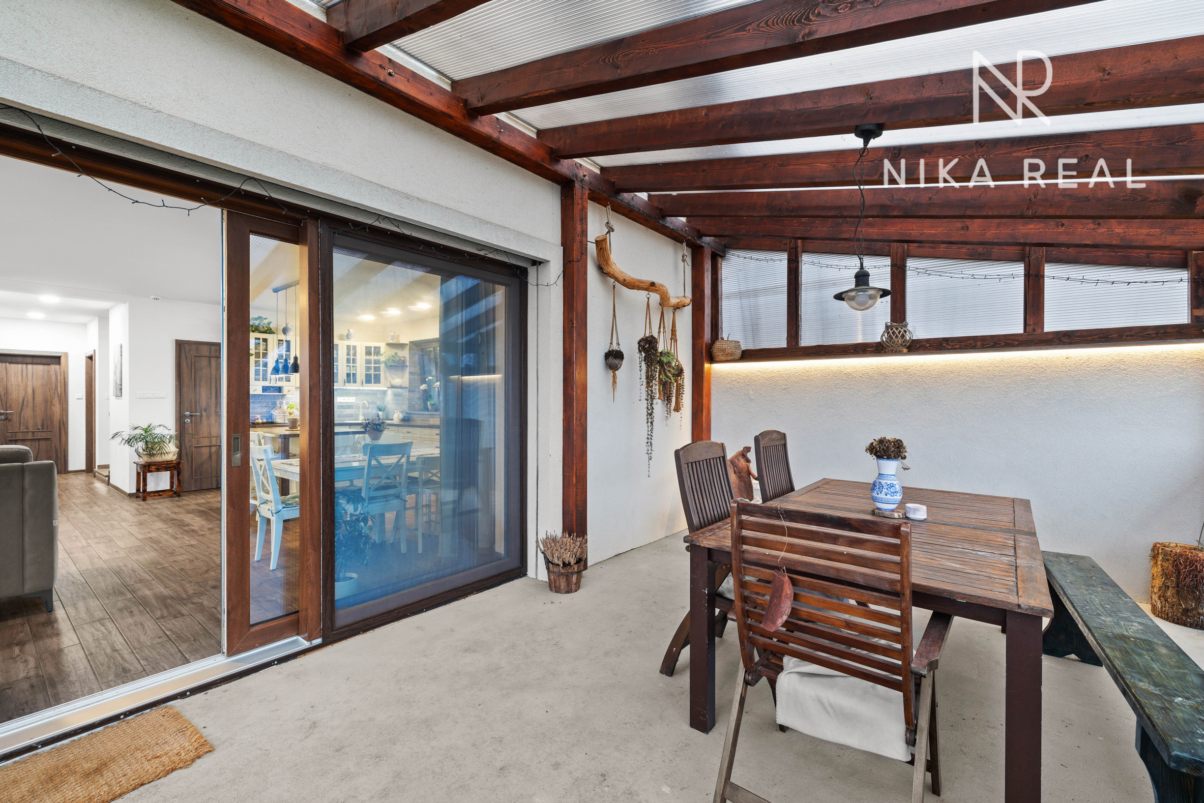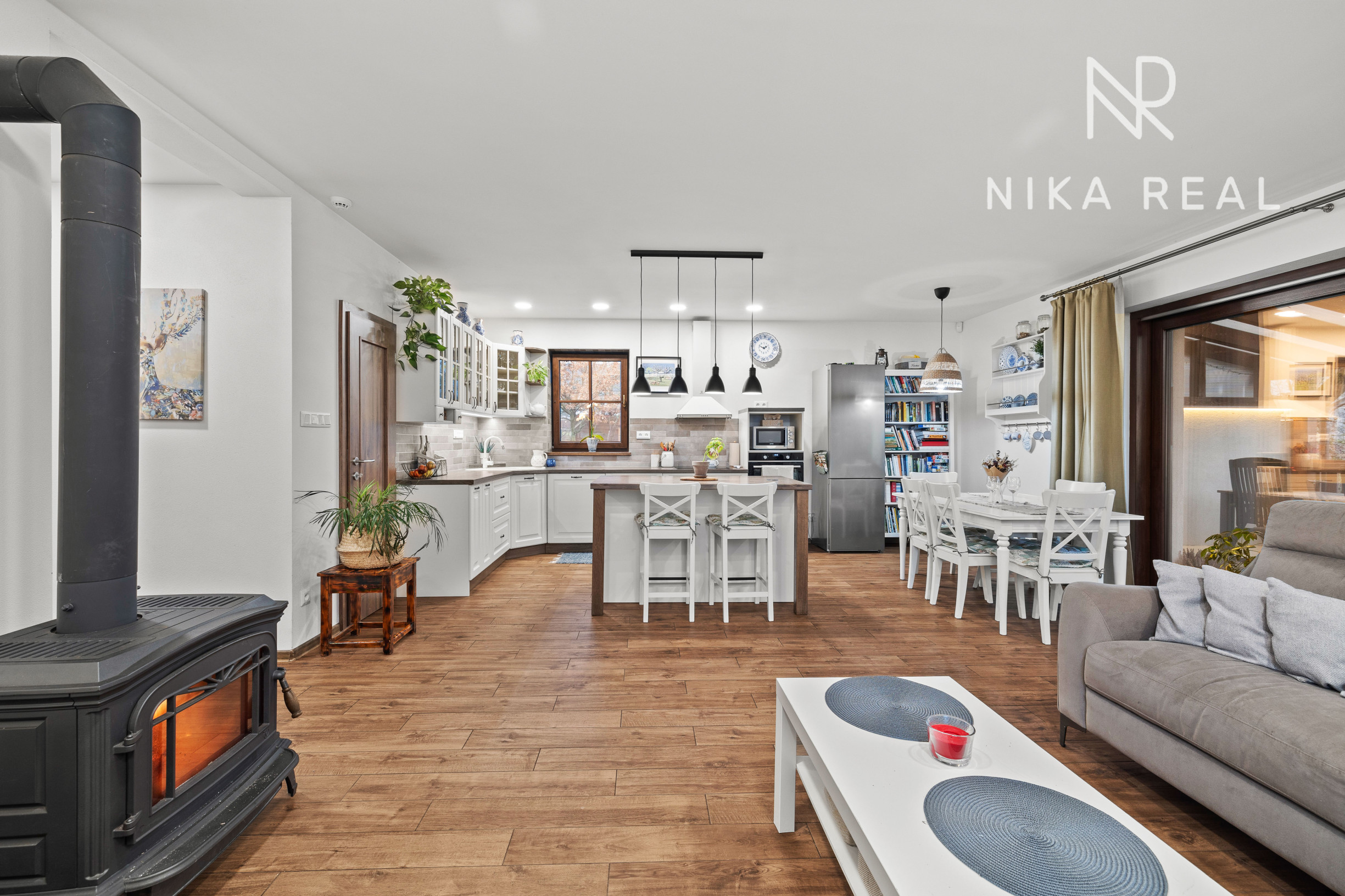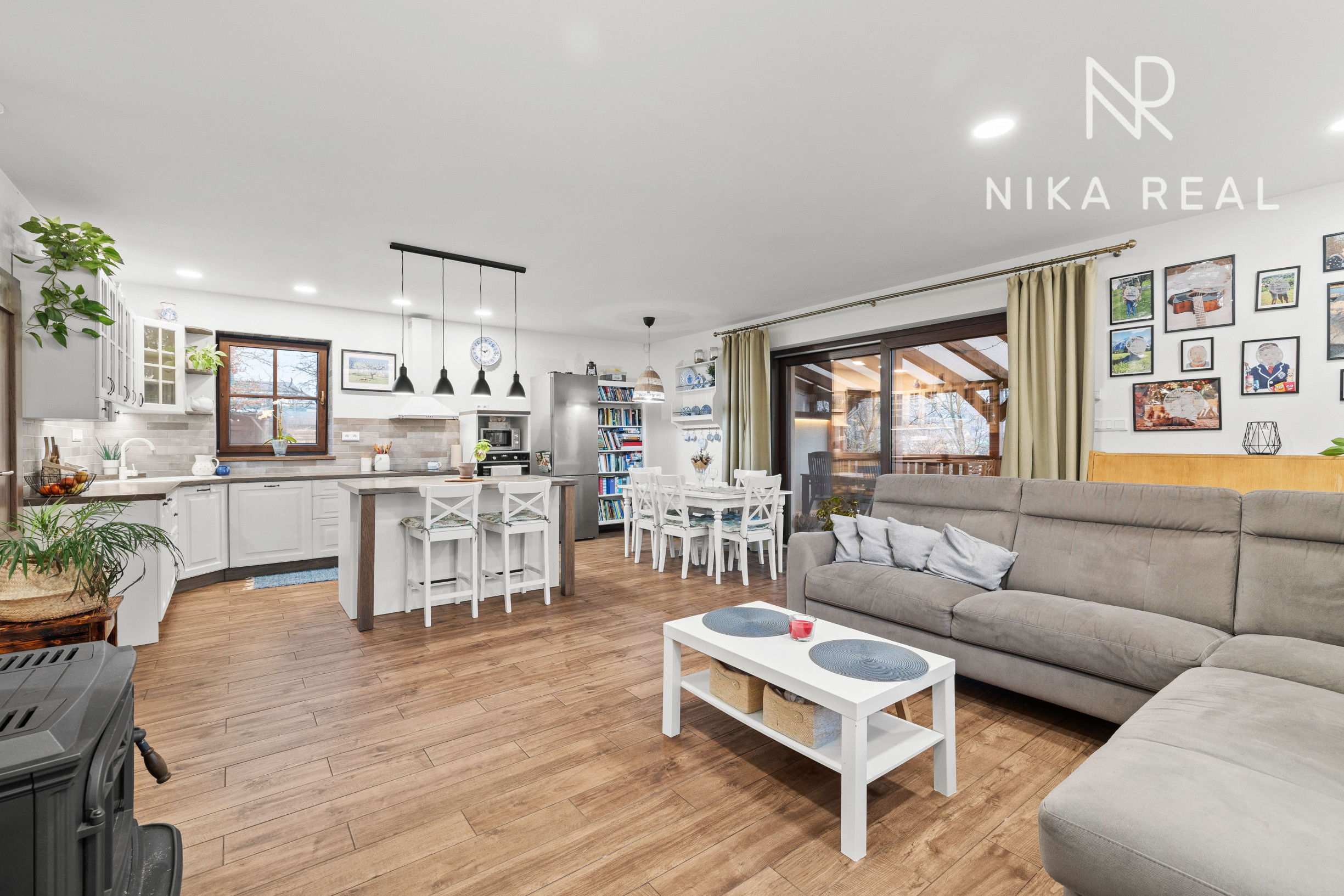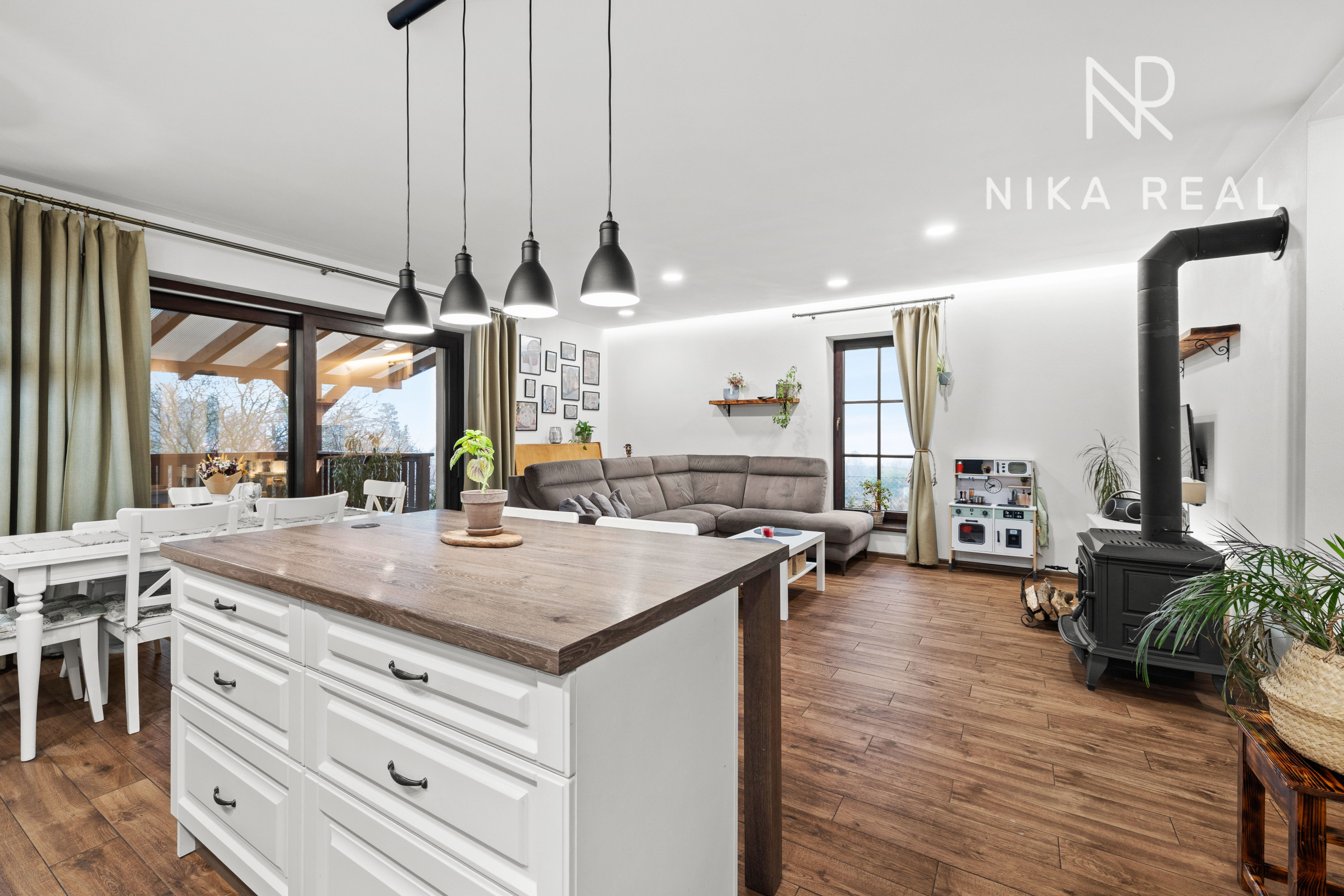 Interiér domu pôsobí príjemne a útulne. Kuchyňa prepojená s obývacou izbou s krbovými kachľami tvorí srdce domu a miesto spoločných chvíľ. Prestrešená terasa s výstupom do záhrady je prístupná priamo z kuchyne a obývačky - ideálne miesto na raňajky, letné posedenia aj pokojné večery.