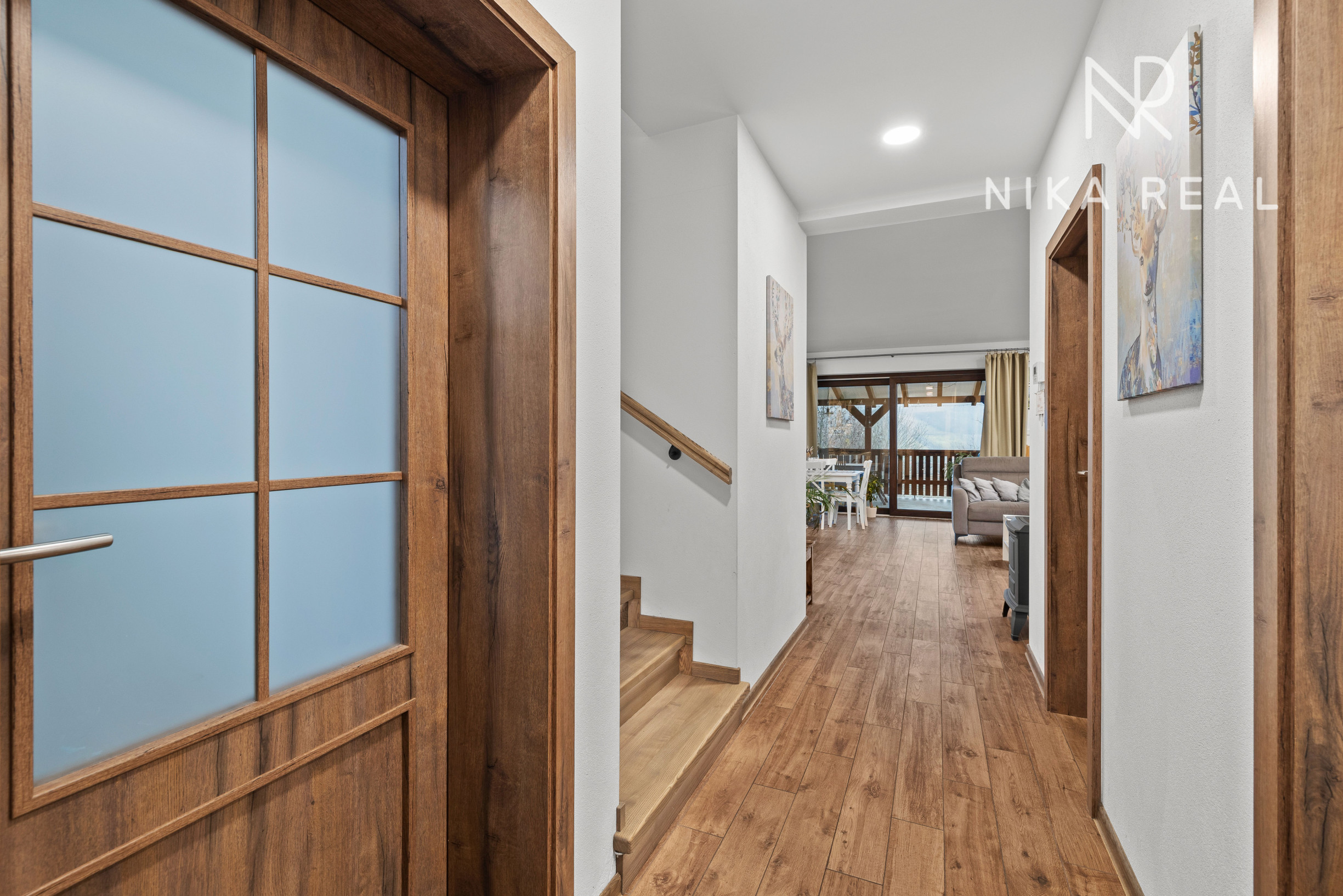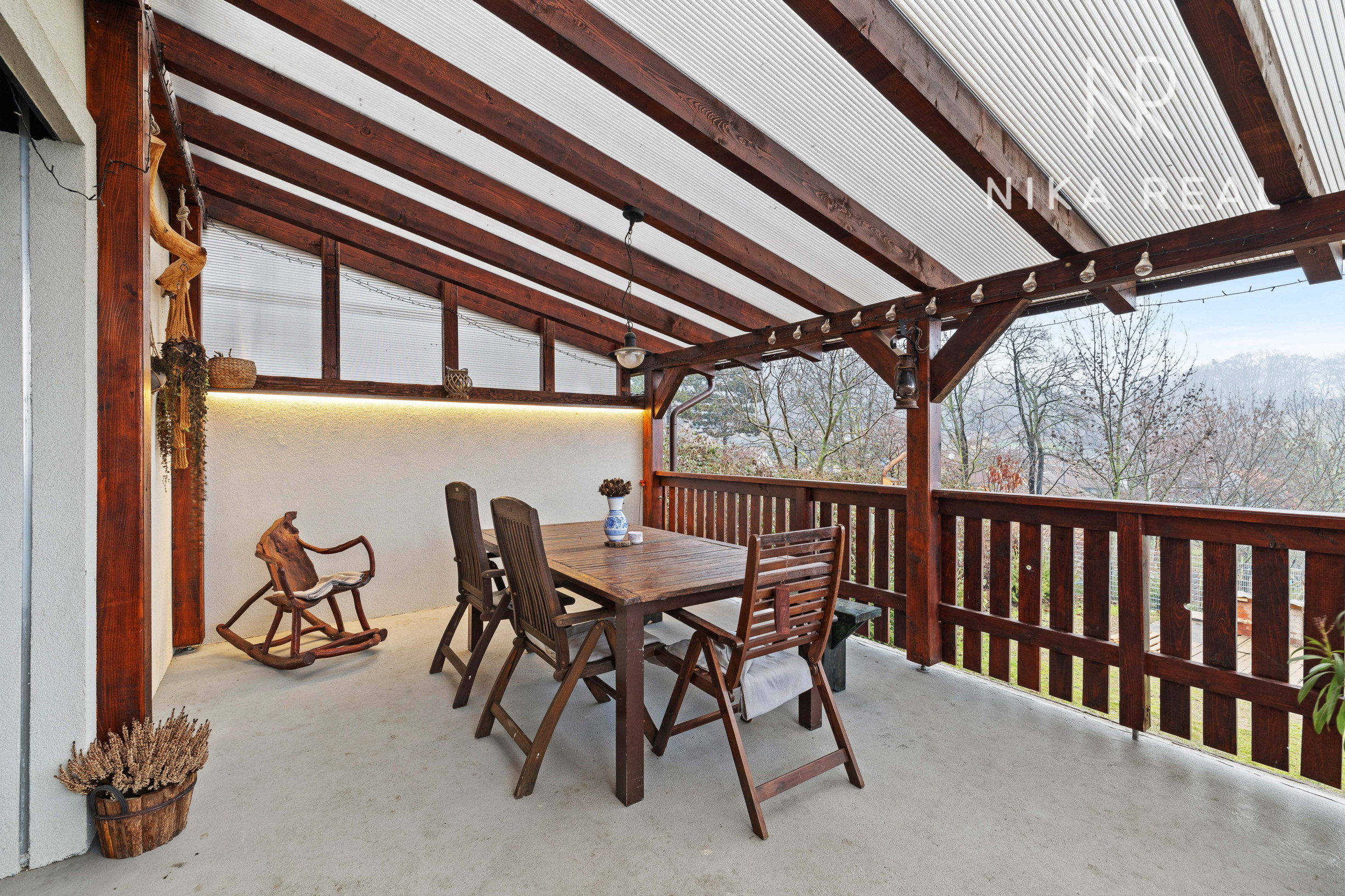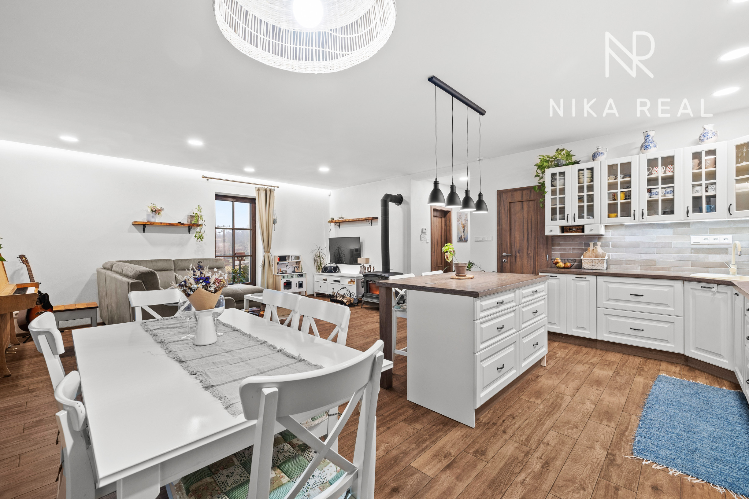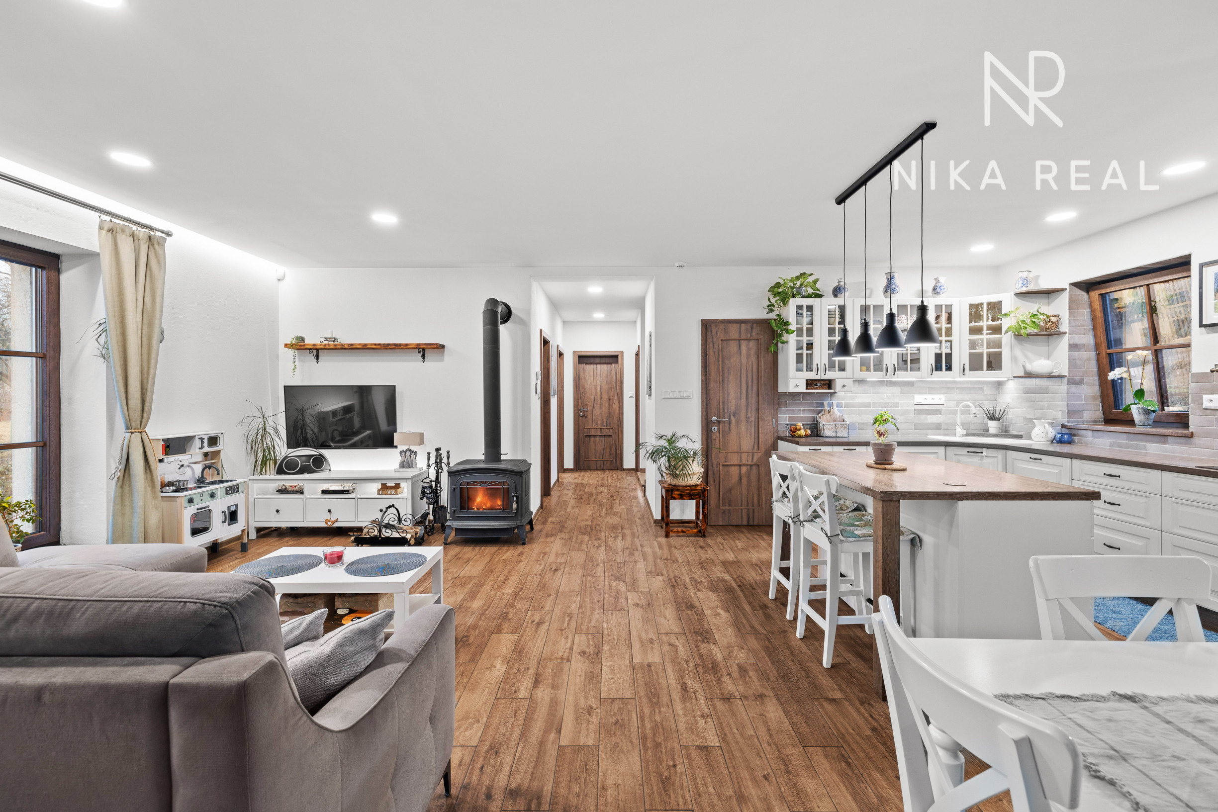 Interiér domu pôsobí príjemne a útulne. Kuchyňa prepojená s obývacou izbou s krbovými kachľami tvorí srdce domu a miesto spoločných chvíľ. Prestrešená terasa s výstupom do záhrady je prístupná priamo z kuchyne a obývačky - ideálne miesto na raňajky, letné posedenia aj pokojné večery.