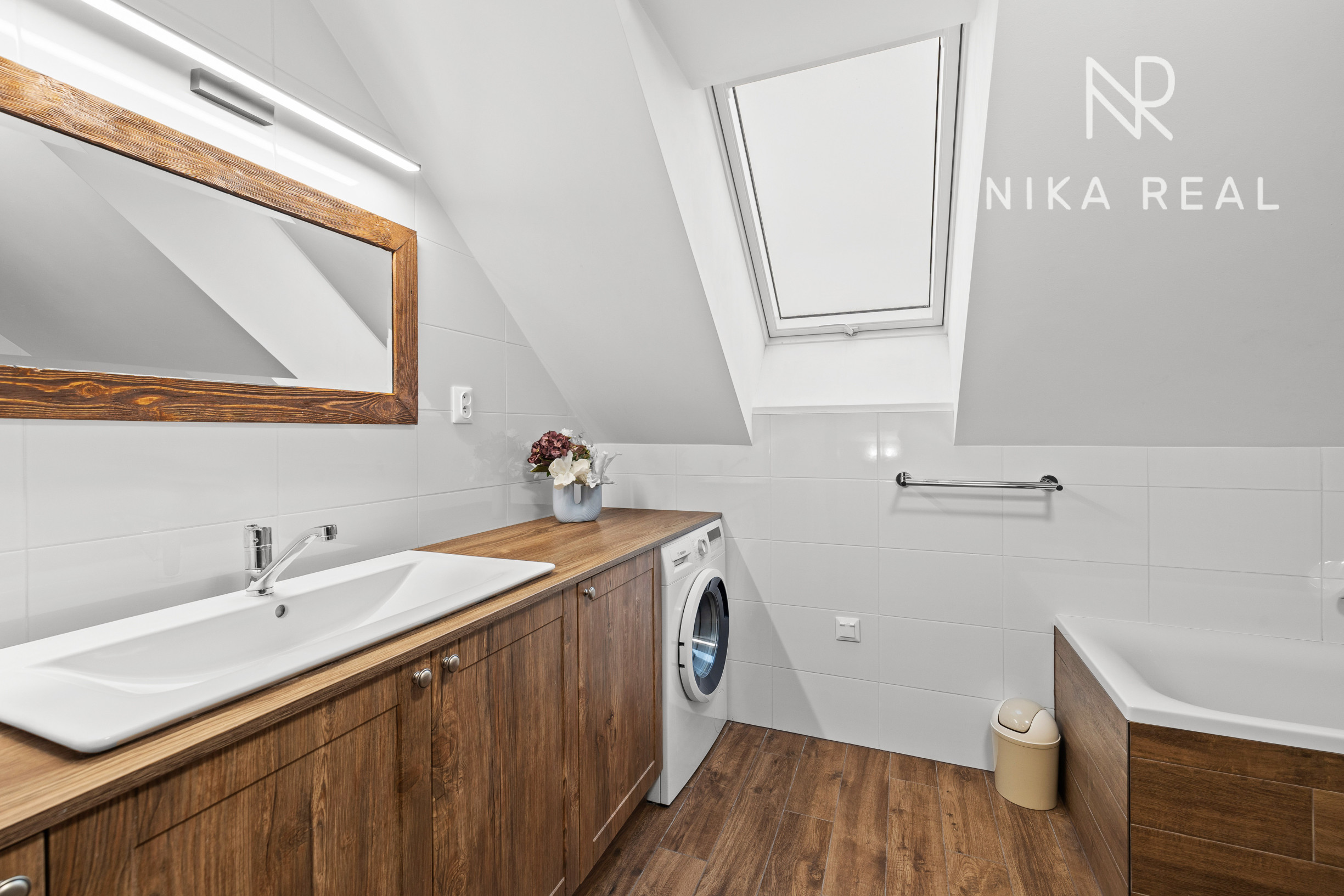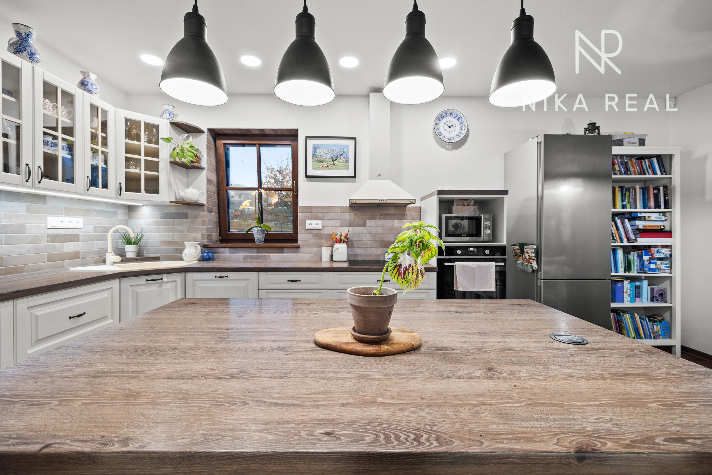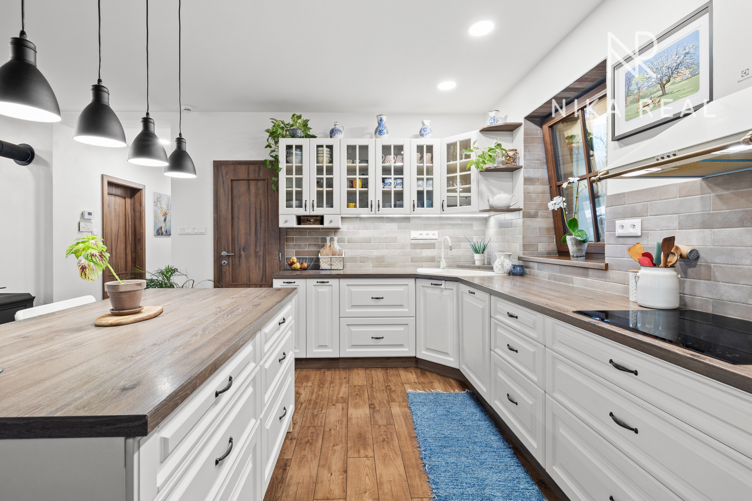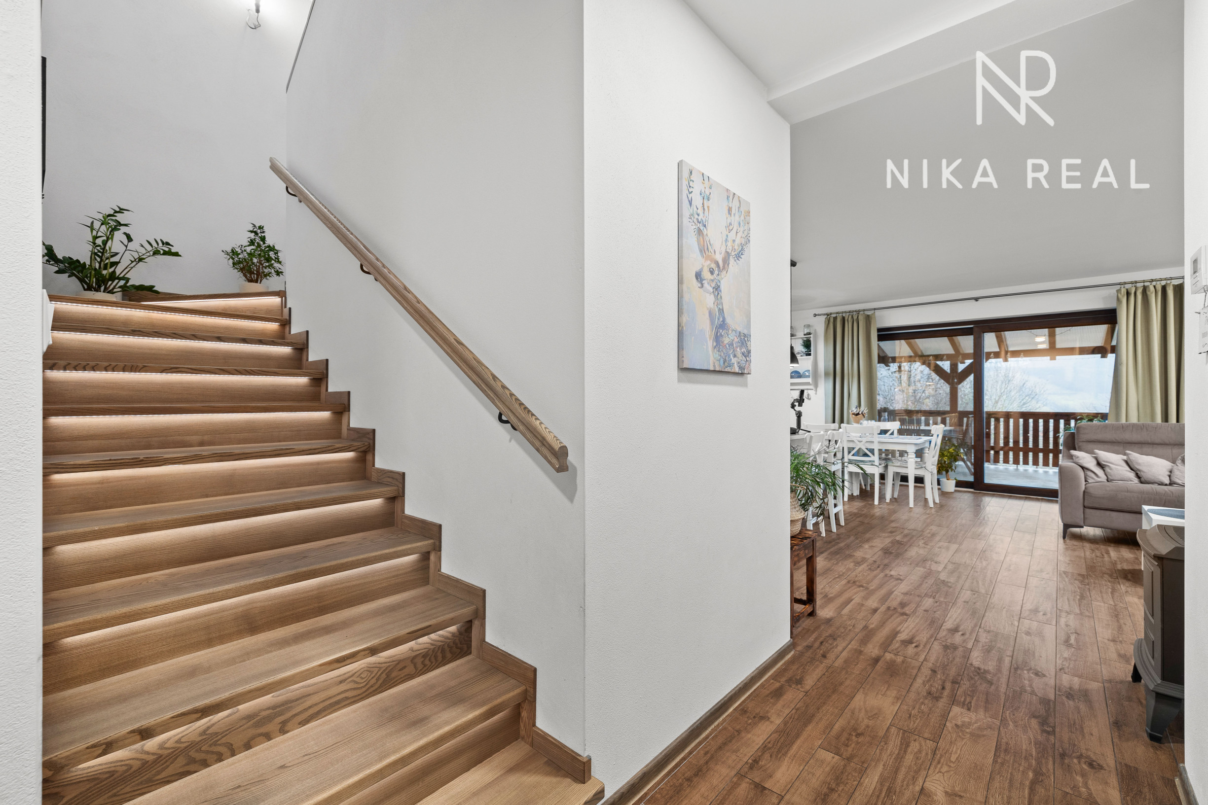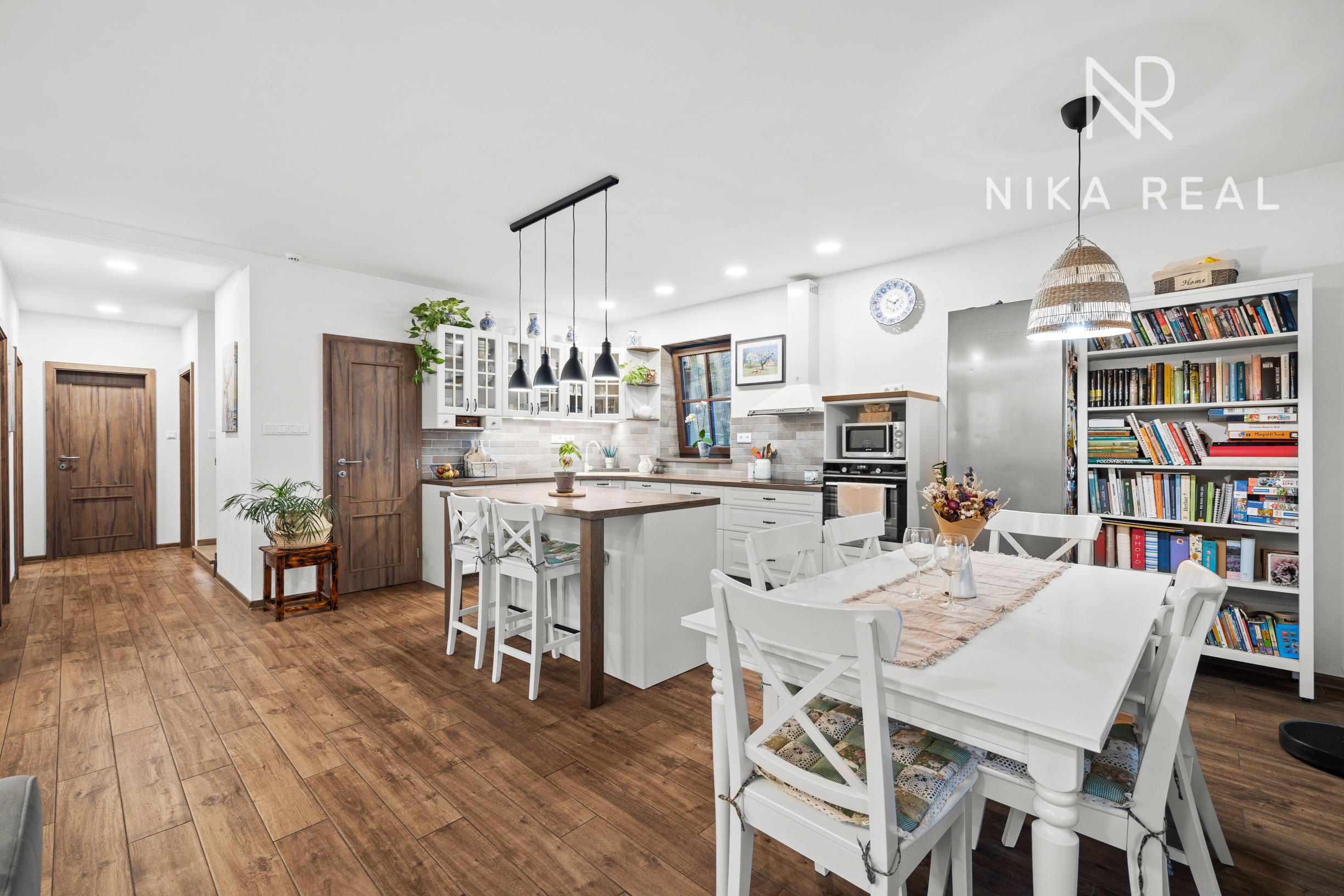 Interiér domu pôsobí príjemne a útulne. Kuchyňa prepojená s obývacou izbou s krbovými kachľami tvorí srdce domu a miesto spoločných chvíľ. Prestrešená terasa s výstupom do záhrady je prístupná priamo z kuchyne a obývačky - ideálne miesto na raňajky, letné posedenia aj pokojné večery.