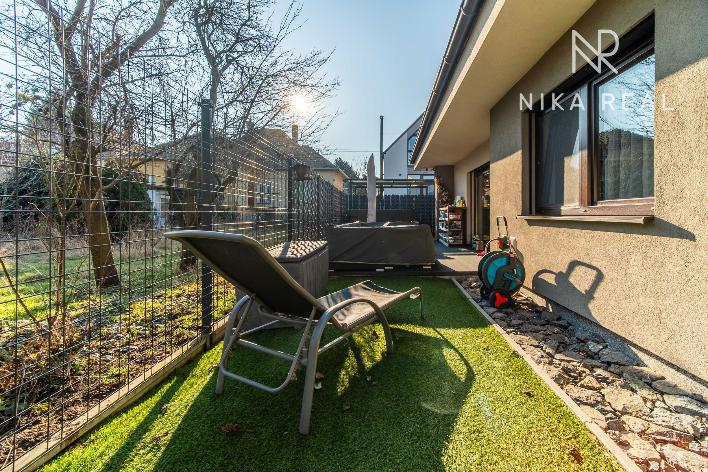 Na pozemku sa nachádza zastrešené parkovanie pre dve autá za sebou, záhradný domček s priestorom na drevo (sendvičová montovaná stavba), terasa so sedením a vírivka pre 6 osôb. Záhrada je riešená bezúdržbovo – geotextília a celoročne zelený umelý trávnik.